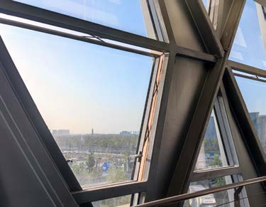 Das Zentrum verfügt über speziell geformte, parallel öffnende Fenster.